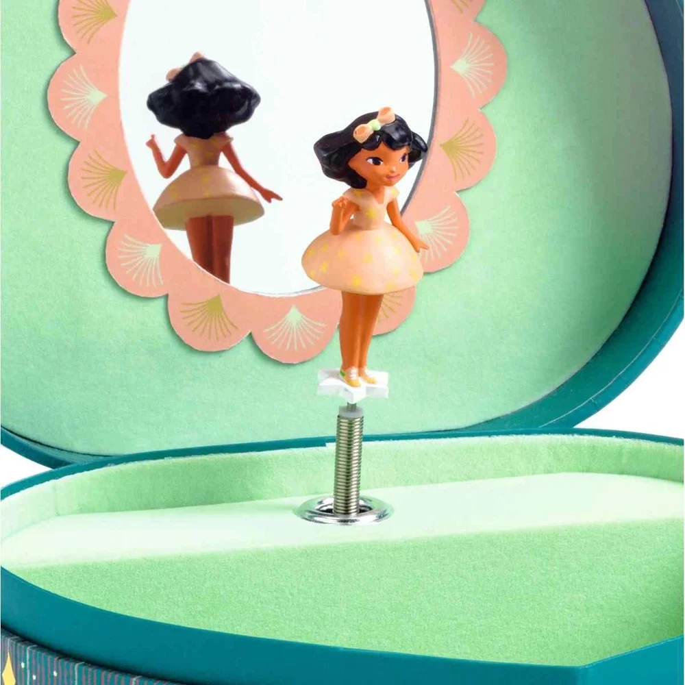 Caixinha de música em forma de coração, para guardar jóias e segredos. Gira a manivela, abre a caixa e surpreende-te: uma Menina delicadamente esculpida, dança e gira ao som da música. A música dura aproximadamente 2 minutos e 30 segundos. Um espelho recortado em forma de coração. Interior forrado a veludo muito macio.