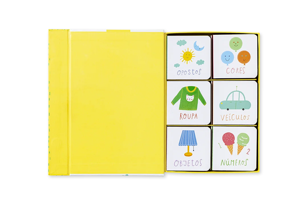 Dentro desta caixa com tampa magnética estão 6 pequenos livros cartonados, desenhados especialmente para mãos pequeninas. As ilustrações temáticas destes dicionários por imagens sobre opostos, cores, objetos, números, e outros conceitos de base, tornam-nos ideais para estimular as primeiras aprendizagens.