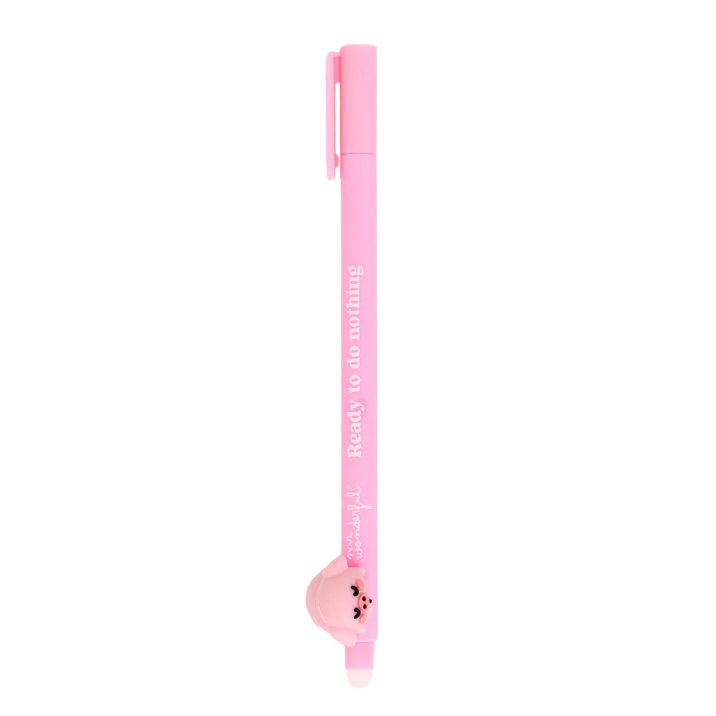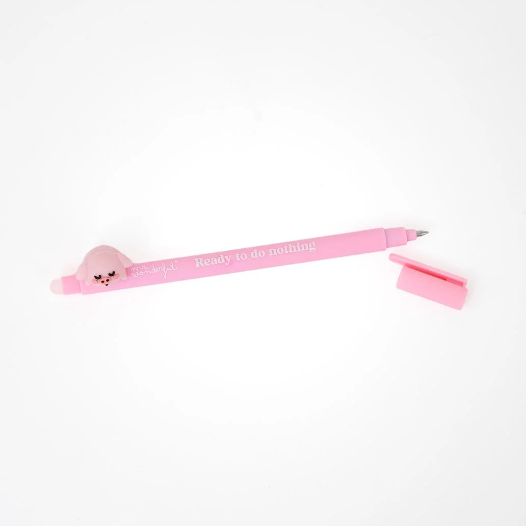Caneta apagável com corpo em plástico, decorada com um dos divertidos personagens Lazy Mr. Wonderful na base. Prática e colecionável, permite escrever e apagar facilmente, aliando funcionalidade a um design descontraído.