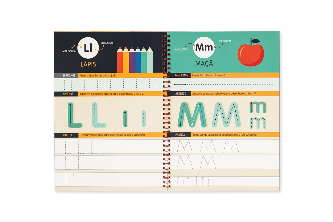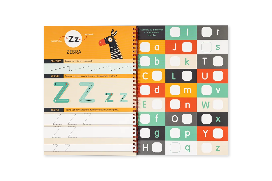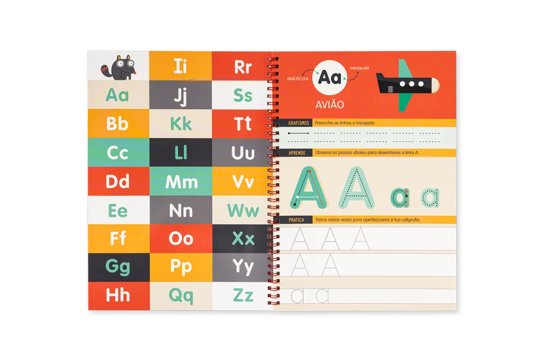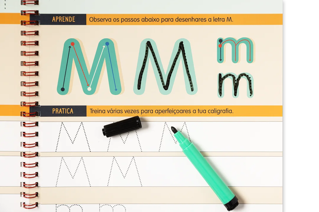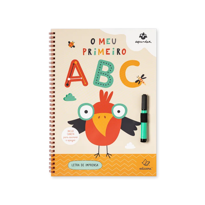 A destacar: Para aprender e treinar o alfabeto em letra de imprensa; desenho de letras maiúsculas e minúsculas; páginas reutilizáveis e caneta com borracha incorporada incluída.