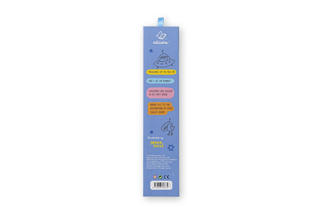 A destacar Papel de formato 25 x 100 cm; acompanha o crescimento até aos 150 cm; quando deixarem de utilizá-la poderão guardá-la de novo na caixa, como recordação.