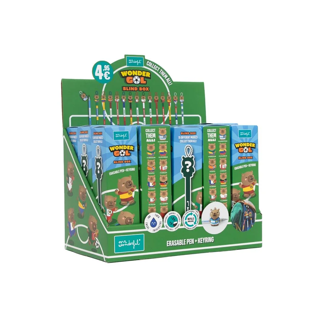 Inspiradas na energia do Mundial de Futebol 2026, estas canetas fazem parte da coleção temática Wonder Gol e vem numa caixa surpresa (blind box)— só descobres qual a personagem no momento da abertura, tornando a experiência ainda mais divertida e colecionável.